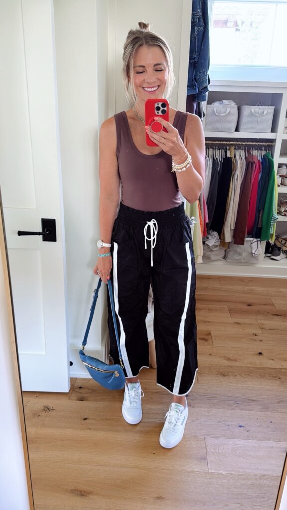 Outfit Details: Track Pants: Amazon (wearing a medium) / Bodysuit: Nuuds (code Julie10 saves 10%) / Sneakers: Reebok (The top-chalk color is the comfy color you can walk in for miles. The others fit differently which I learned the hard way!) / Bag: Clare V. / White Bracelet Stack: Amazon / Thin Bead Bracelet Stack: Gorjana