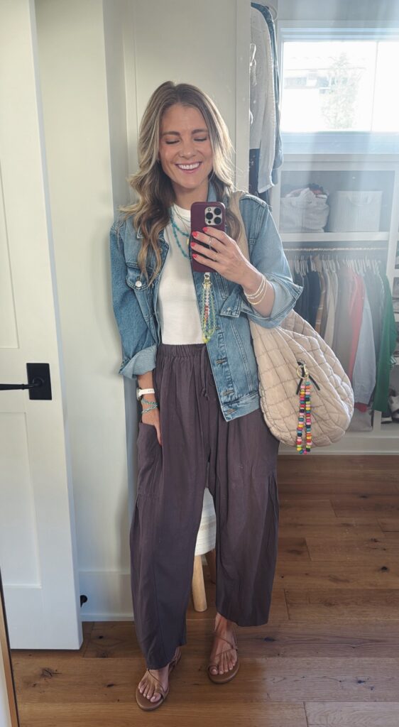 Outfit Details: Denim Jacket: J.Crew Factory / Pants: Amazon (same pants as in looks #1 & #3; sized down to a small) / Tank: Target /Bag: Free People / Bag Charm: Bauble Bar / Sandals: Target / Thin Gold Necklace: Gorjana / Blue Layered Bead Necklace: Bauble Bar / Dog Tag Name Necklace: Tiny Tags/ Thin Bead Bracelet Stack: Gorjana