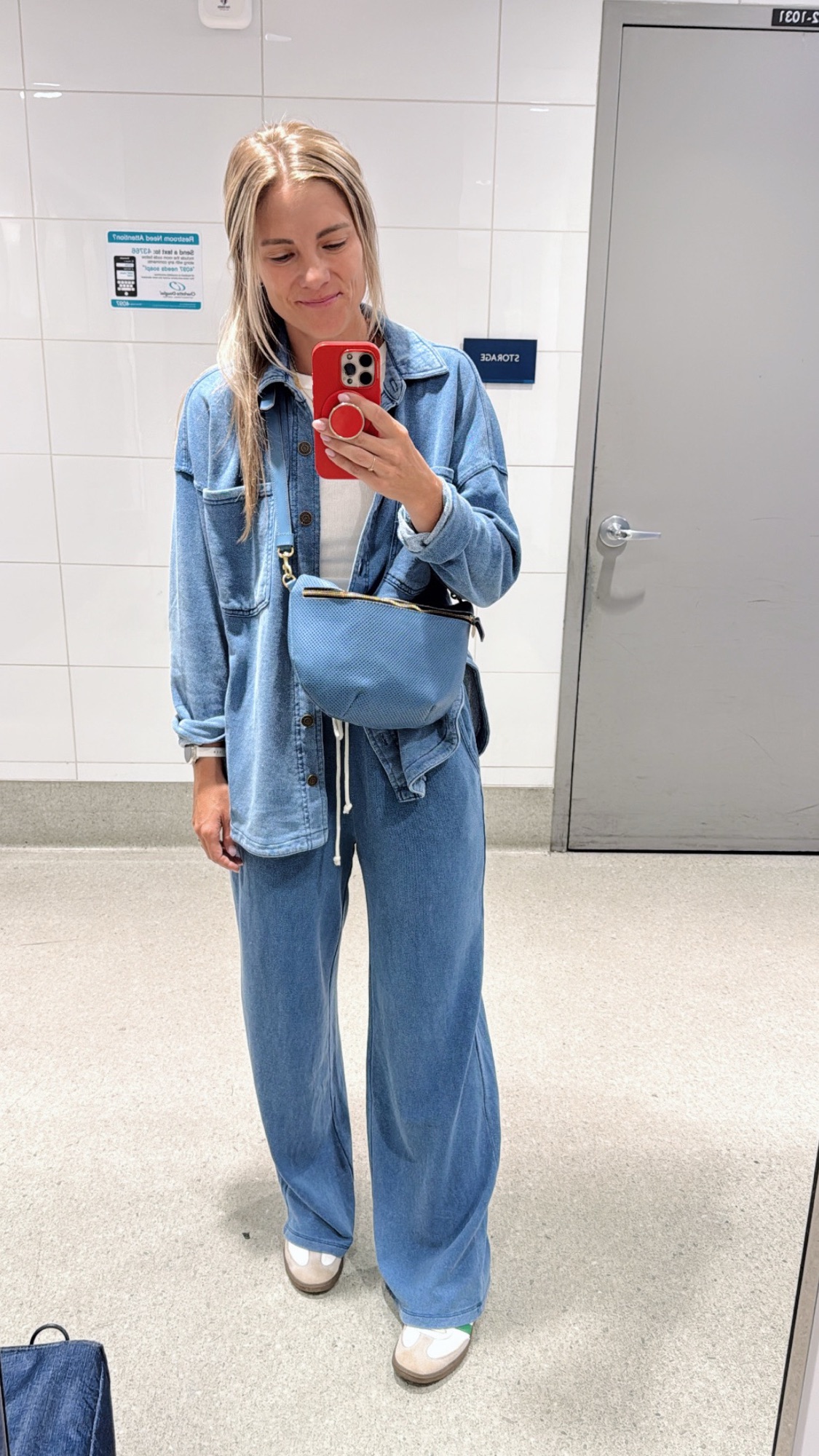 Outfit Details: Knit Denim Jacket: Z Supply/ Knit Denim Pants: Z Supply / Tank: Target / Shoes: Adidas / Bag: Clare V.