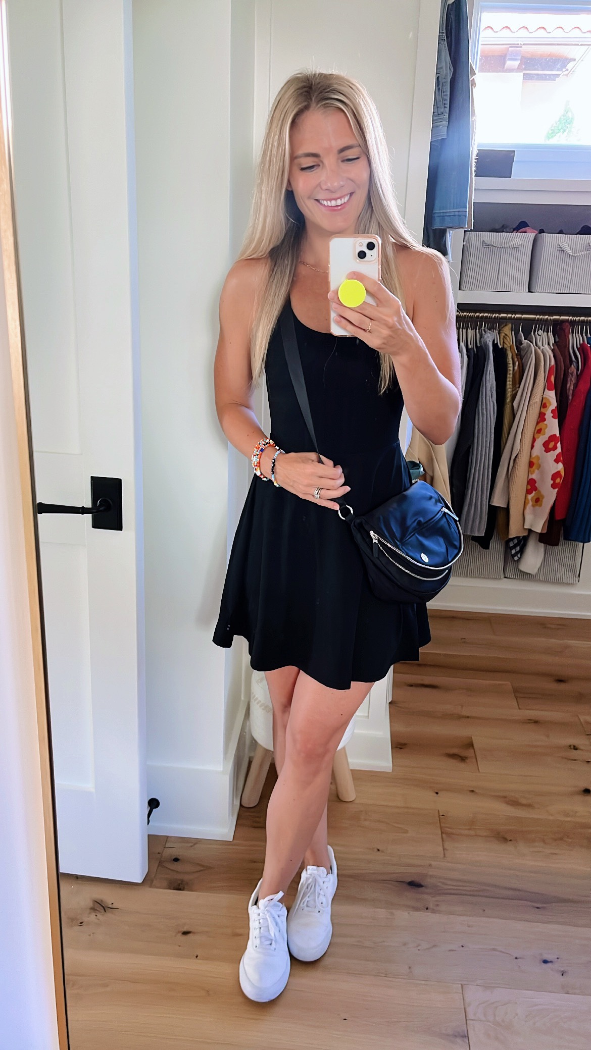 Outfit Details: Athletic dress: Amazon (the back is the best part!) / Bracelets: Shopbop (old) / Shoes: Adidas / Bag: Lululemon / Paperclip Chain Necklace: Amazon