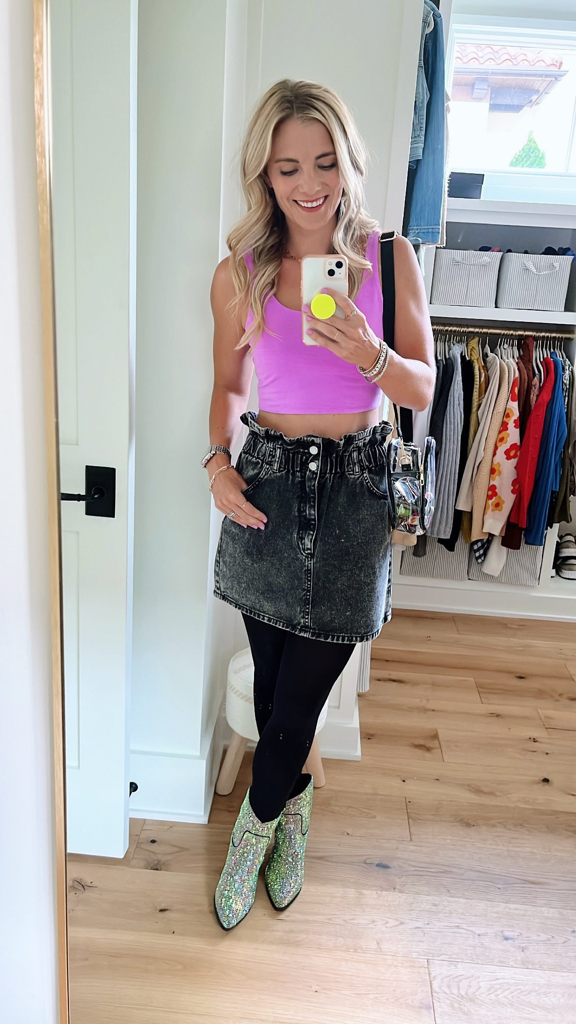 Outfit Details: Cropped Tank: Target / Skirt: TopShop (old) / Clear bag: Amazon / Boots: Amazon / Paperclip Chain Necklace: Amazon / Layered Gold Bracelets: Target