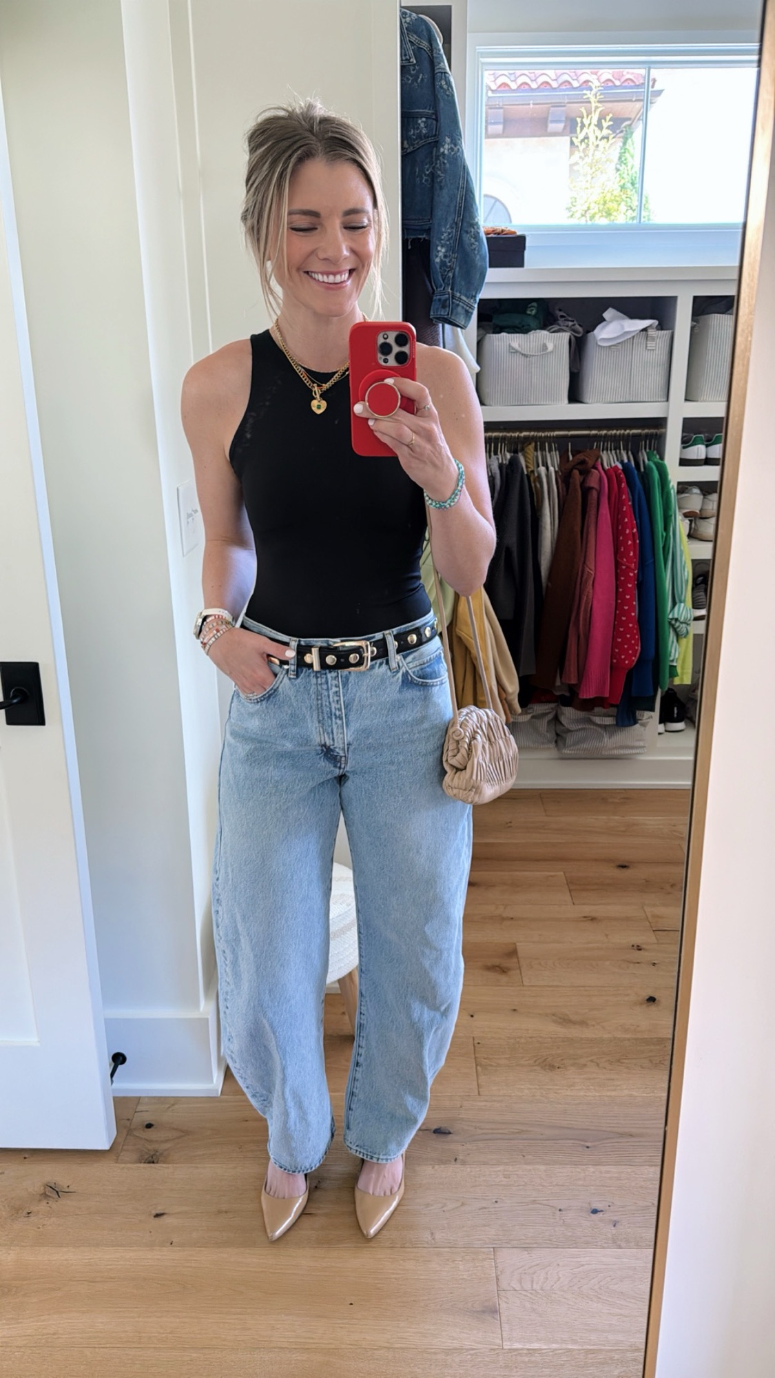 Outfit Details: Bodysuit: Amazon / Jeans: Frame / Belt: Amazon/ Bag: Mode Luxe (via Stitch Fix) / Necklaces: Gorjana Amour Necklace + Amazon Heart Necklace