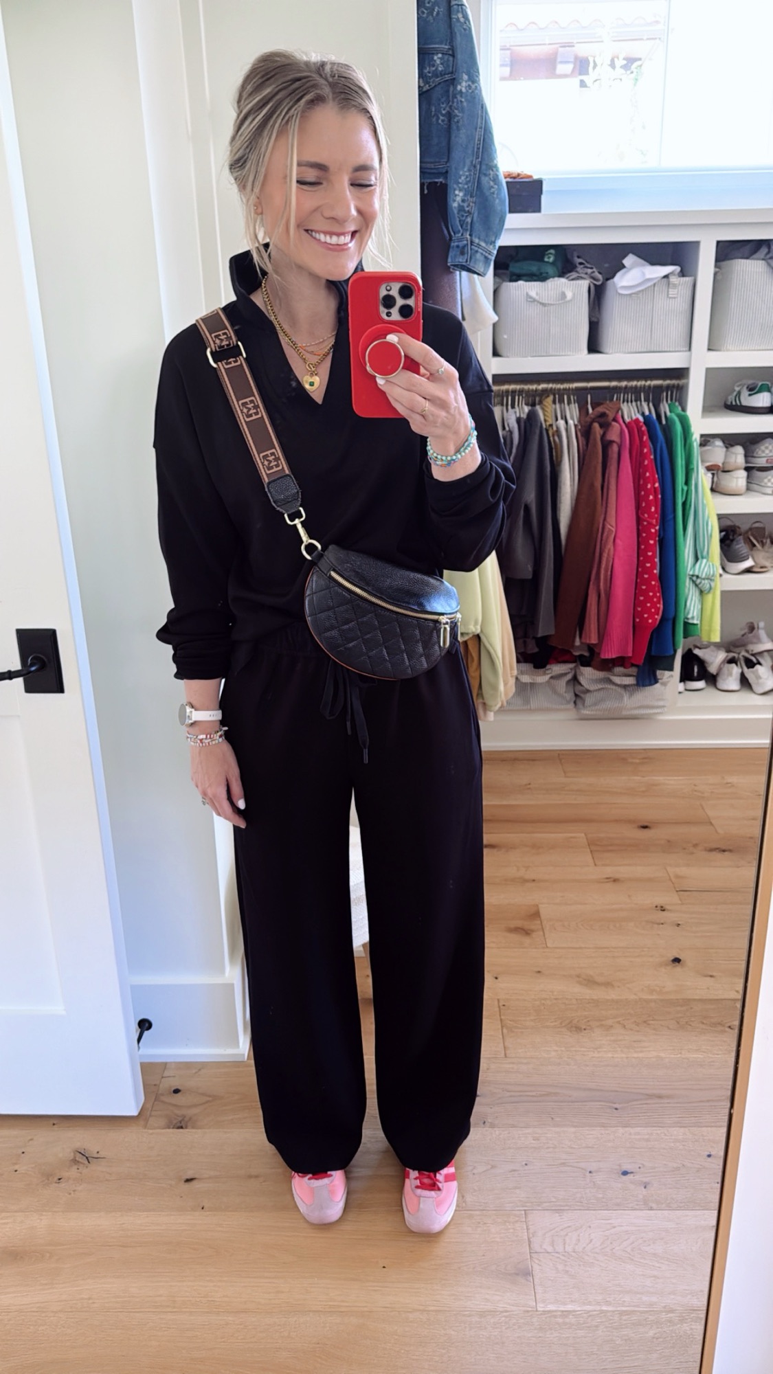 Outfit Details: Fleece sweatshirt: Amazon / Joggers: Vuori / Sneakers: New Balance / Luggage: Samsonite / Beanie: Target / Bracelets: / Watch: Garmin