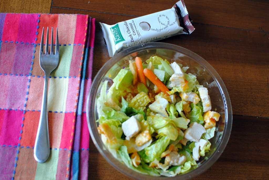 Lunch today included an Asian salad which chicken, wonton strips, carrots, celery and ginger dressing. Plus a Kashi dark chocolate coconut bar!