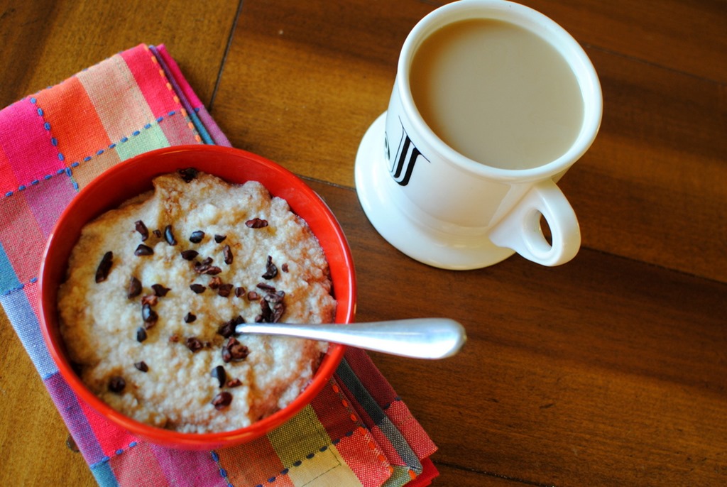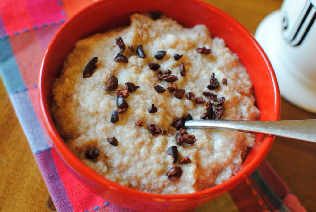 I topped my oatless oatmeal with a sprinkle of cacao nibs for some chocolaty crunch.
