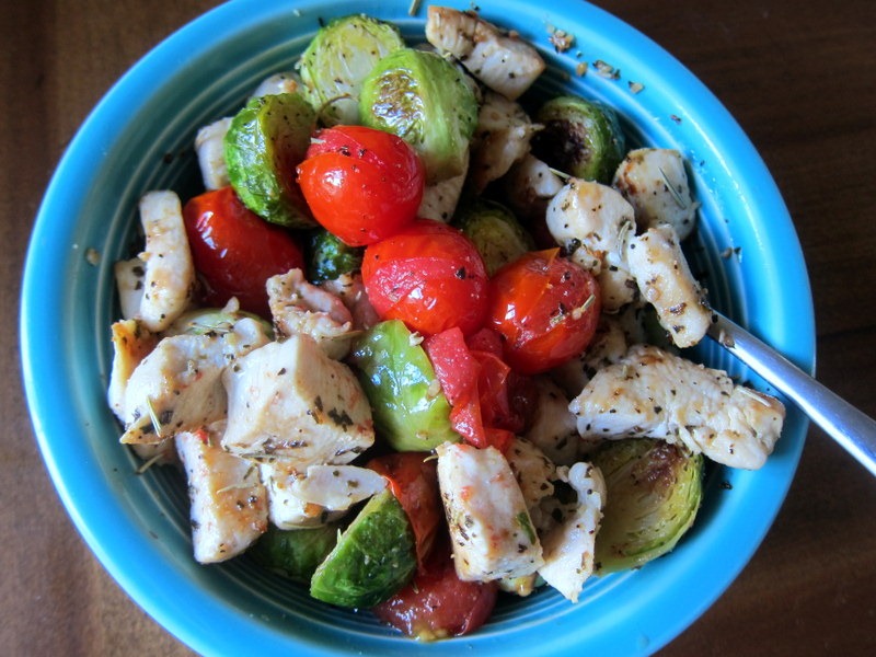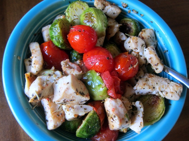 I tossed the tomatoes and Brussels sprouts in olive oil, garlic salt and pepper and roasted them for 20 minutes at 400 degrees. While they were roasting, I sautéed chopped chicken breasts in olive oil and seasoned them with salt, pepper, rosemary and basil.
