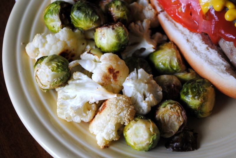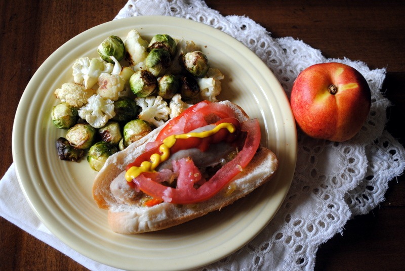 Lunch today was reminiscent of yesterday’s mid-day meal and included a chicken apple sausage served with a side of roasted Brussels sprouts and cauliflower and a cold nectarine.