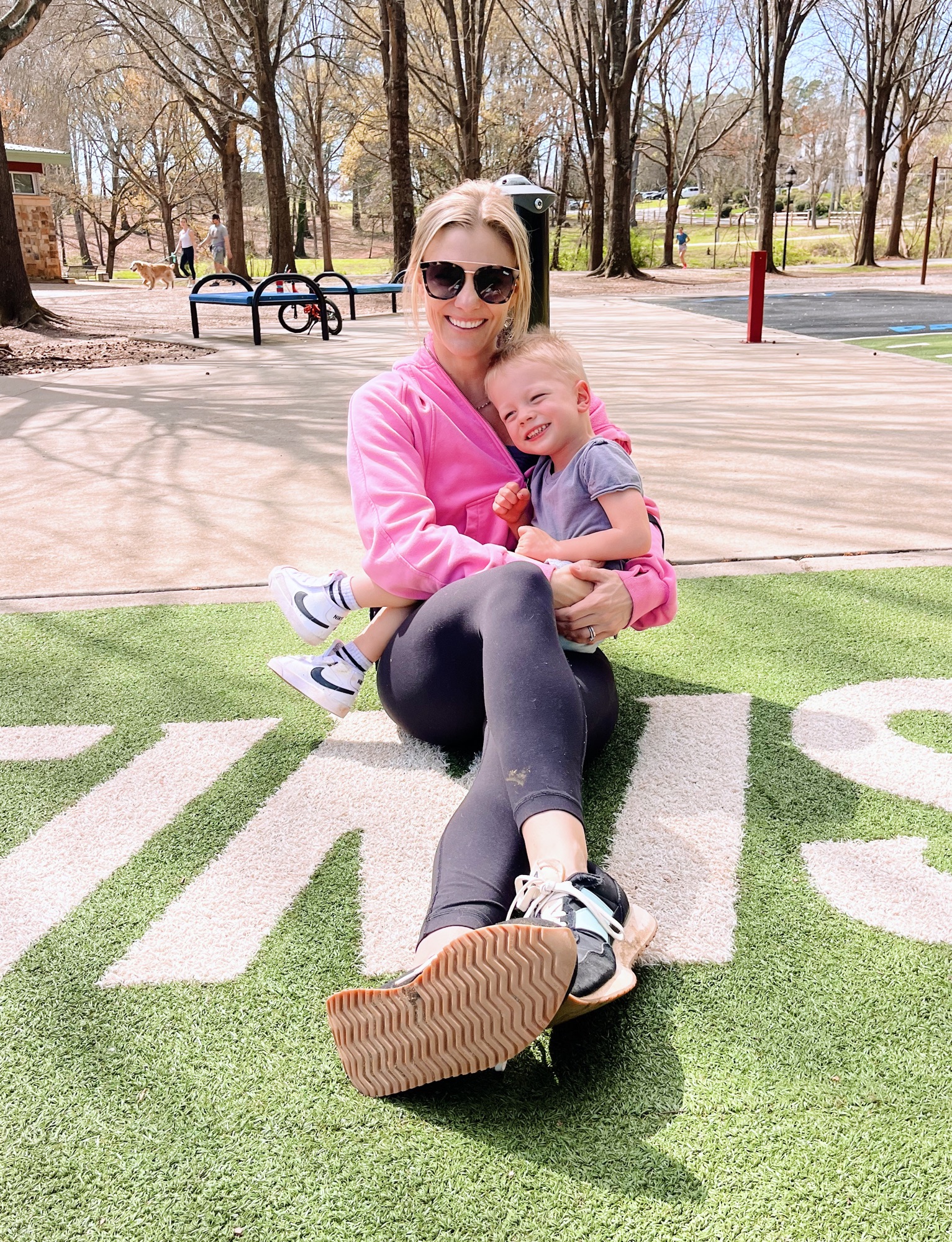 (Sweatshirt: Amazon / Leggings: lululemon / Sneakers: New Balance / Sunglasses: QUAY / Rhett’s Sneakers: Nike / Boy’s Retro Crew Socks: Amazon)