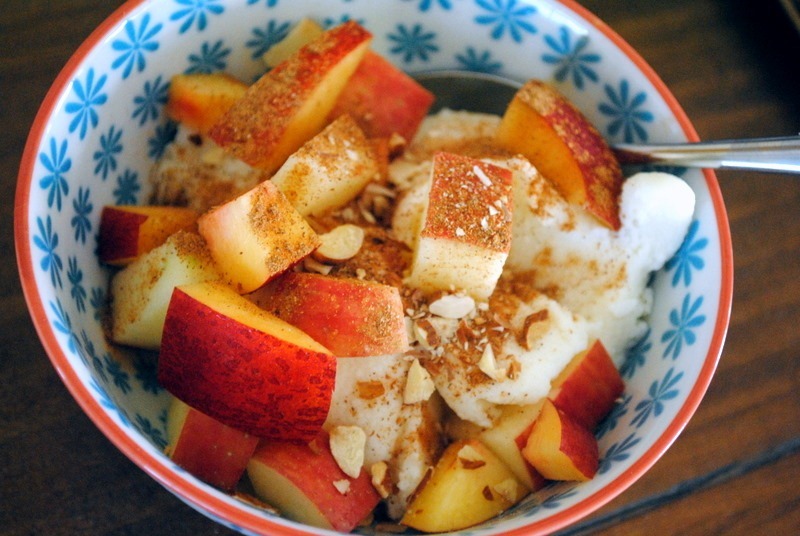 In a bowl with fresh fruit, slivered almonds and a sprinkle of cinnamon for a morning snack!