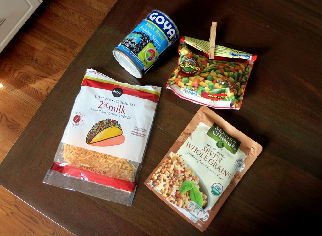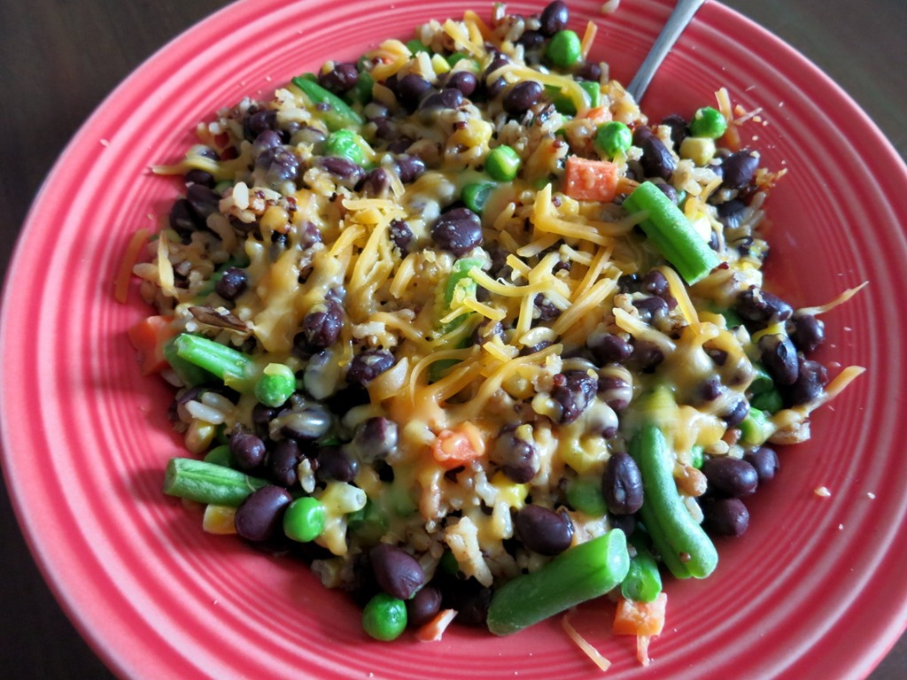 I simply microwaved the whole grains and frozen veggies and rinsed and drained the black beans, stirred everything together and topped the bowls with cheese before microwaving them for a little while longer.