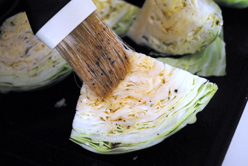 After trimming the cabbage and cutting it up into eight pieces, I brushed the vegetable with the vinaigrette using a pastry brush.
