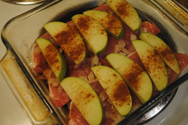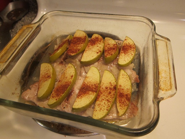I then placed the pork on top of the apples, seasoned it with salt and pepper, sprinkled the remaining onions on top before adding the remaining apple slices and a hefty sprinkle of cinnamon.