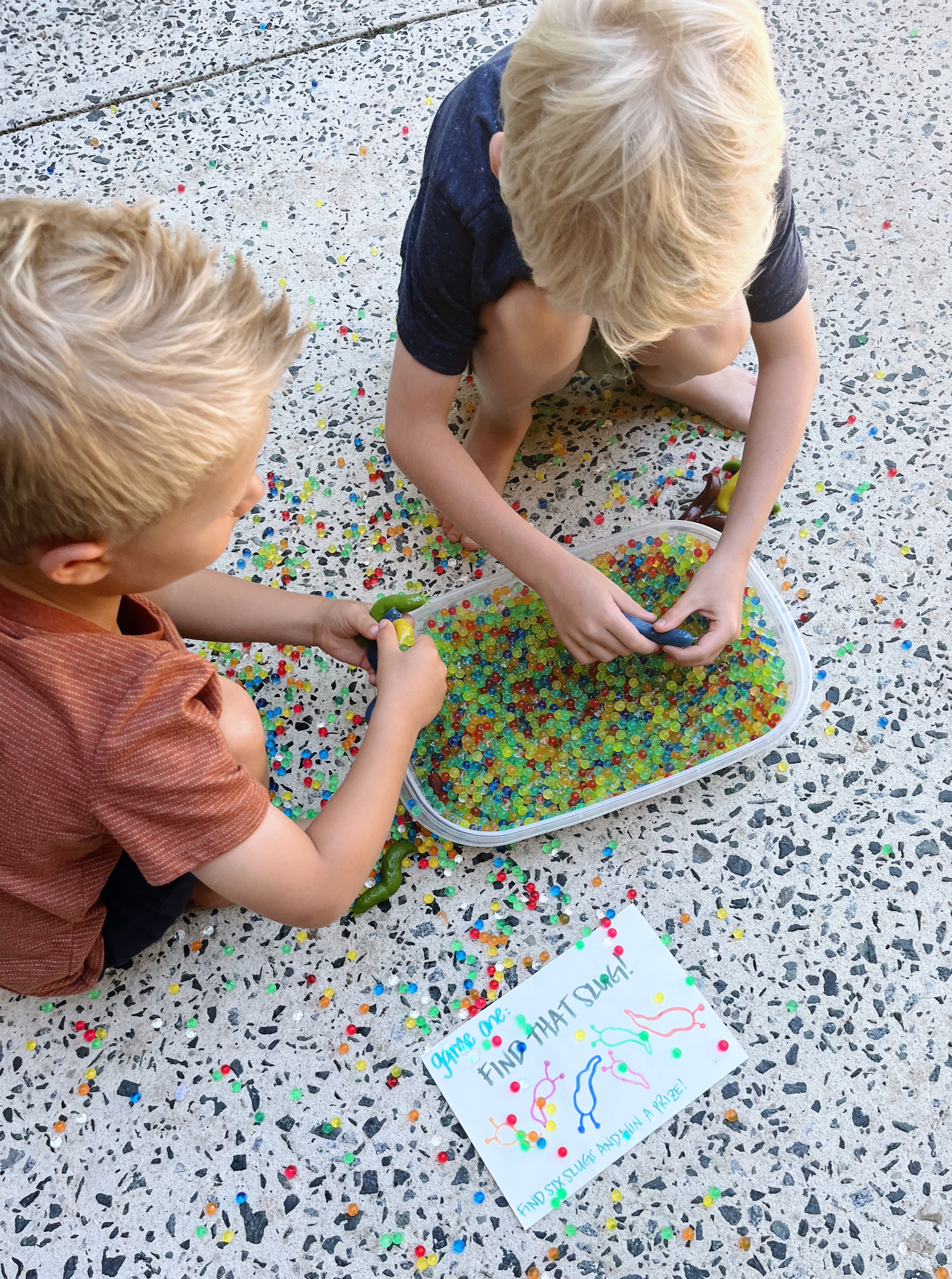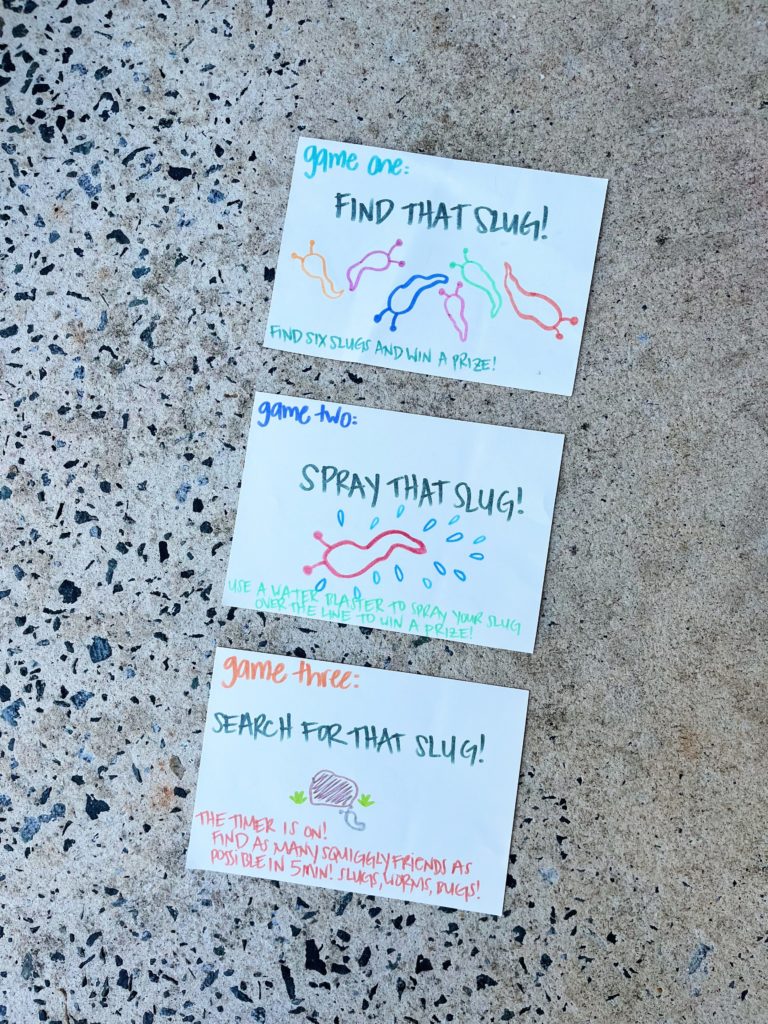 Game number one was “Find that Slug” and the big kids had to search a container of water beads and find six slimy slugs in order to win a prize. (Bless you, Amazon, for keeping weird things like slimy slugs in stock.)