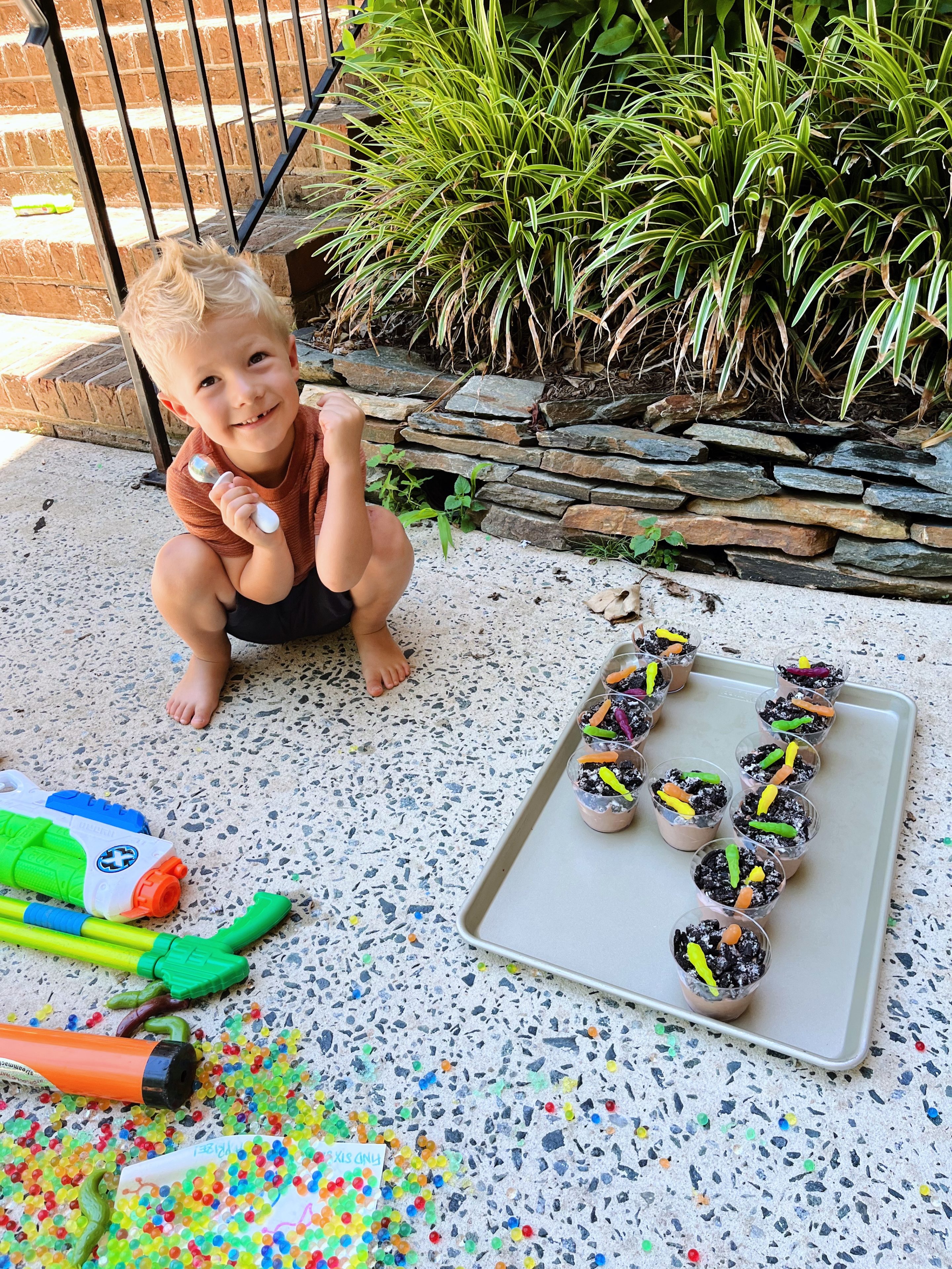We set out to create a low-key party with a slug theme because there’s not much Ryder loves more right now than searching for slugs under the rocks in our yard. As it turns out, according to the internet, exactly ZERO children have wanted slug-themed birthday parties. Pinterest inspiration for slug-themed parties was… um… sparse. We did our best to brainstorm a few fun games and LOVED the recommendation I received from a bunch of you guys on Instagram that encouraged me to make dirt cups topped with gummy worms for Ryder’s special day.