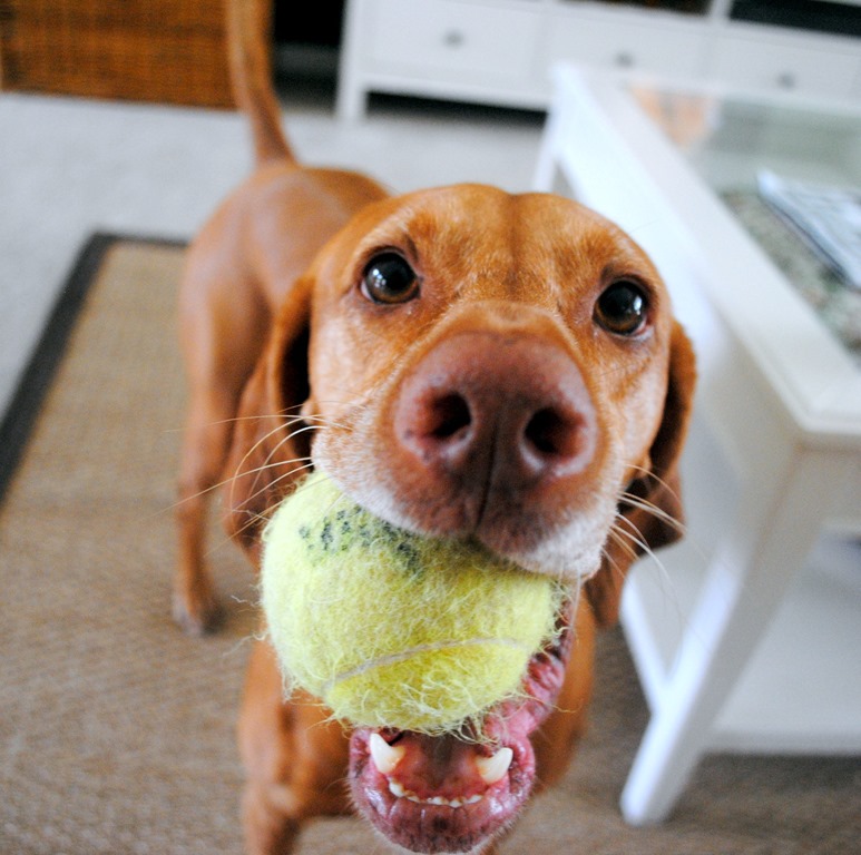 I have a viszla who acts the same way! Too funny. Always a toy in her mouth. Sadie puts such a smile on my face! 🙂