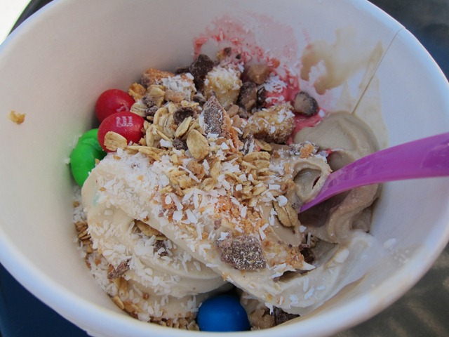 Today’s mix included caramel custard, red velvet and espresso fro yo topped with peanut M&Ms, coconut, Heath bar bits, Butterfinger crumbles, cheesecake pieces and brownie bites. So darn delicious!