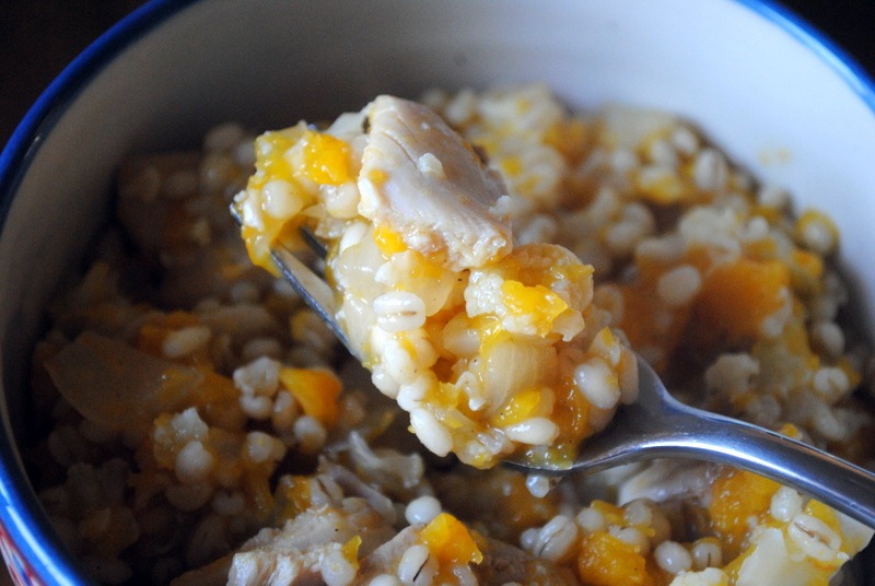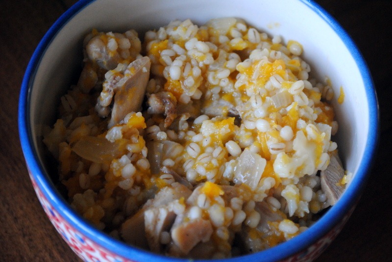 Earlier this week, I made a batch of my butternut squash mock risotto, but instead of wheat berries, I used barley and also added cauliflower and chicken to the pot.