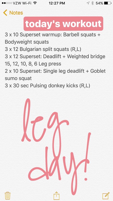 Yesterday morning I hit up the gym for a solo leg workout! Once Chase was settled in childcare, I took myself through a workout that left my quads, hamstrings and booty burnin’. I planned out my workout the night before so I could just plow through it at the gym and incorporated supersets, drop sets and heavy lifting for lots of variety. I sure do love Burn Boot Camp but there’s just something about creating my own workouts that cater exactly to my preferences that my body craves sometimes. Variety is key for this girl!