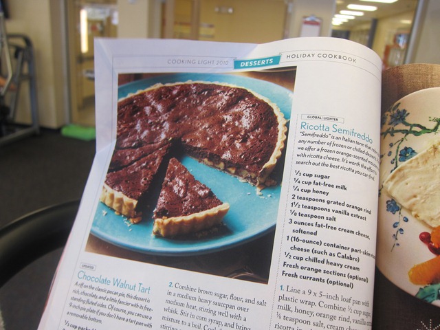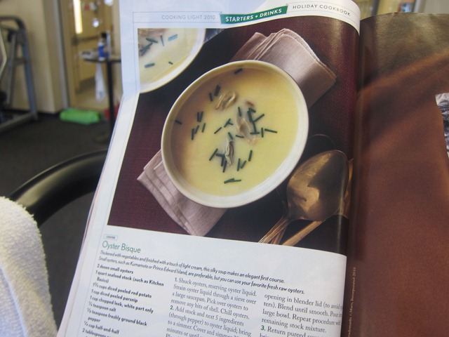 I had the latest issue of Cooking Light to entertain me and flagged a bunch of recipes I want to tackle.chicken sandwich 013Chocolate walnut tart… Gimme!chicken sandwich 014I would like to try to make this oyster bisque this weekend. It looks delicious and I bet it would make our apartment smell fantastic.