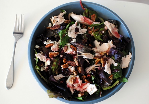 On the menu for today was a big salad with chicken, dried cranberries, pecans, feta and raspberry vinaigrette dressing.