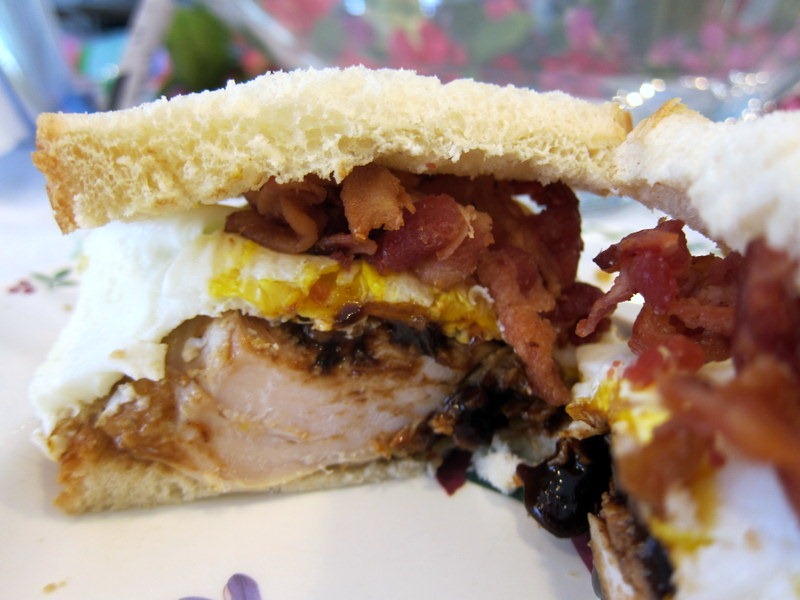That would be a fried chicken, BBQ sauce, fried egg and bacon sandwich. I had a bite and I must tip my hat to the chef. It was pretty darn good!