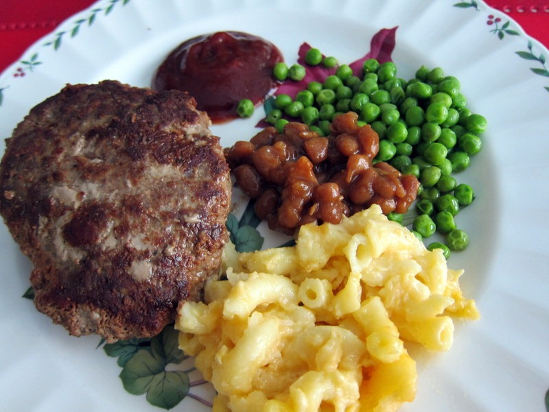 We had burgers, macaroni and cheese, baked beans and peas. I went back for thirds of the mac and cheese. I love extra cheesy mac and cheese!