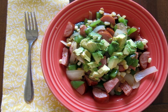 When we arrived home, we were awfully hungry, so I prepared a quick single-skillet meal that included chicken sausage, onions, sweet corn and peppers.