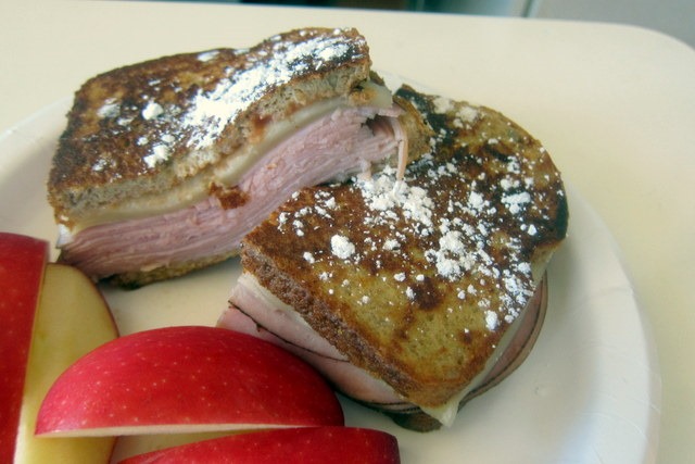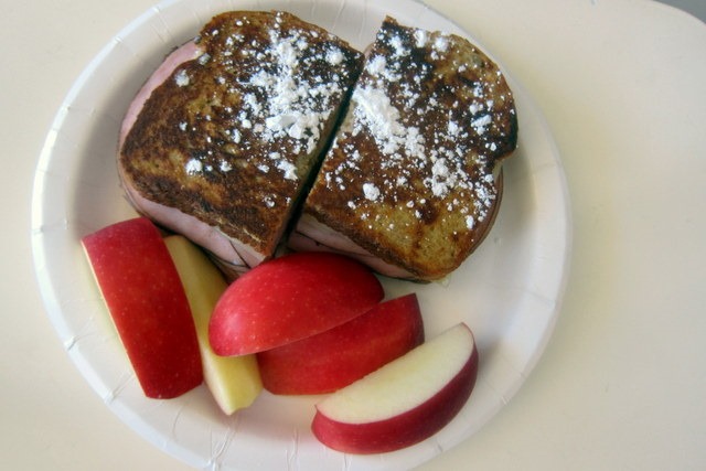 Ham + Turkey + Swiss + Thousand Island dressing on French toast dusted with a bit of powdered sugar. Served with a sliced apple on the side.