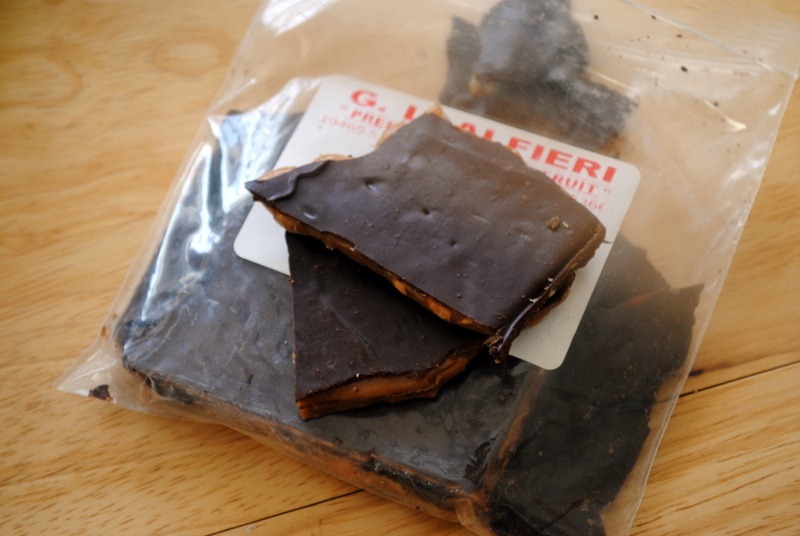 So the people that do that Almond Brittle are from California and they’re always at the SF Farmers Market at the Ferry Building handing out samples and ohhhh my they are delicious! Did you get milk or dark chocolate almond brittle?