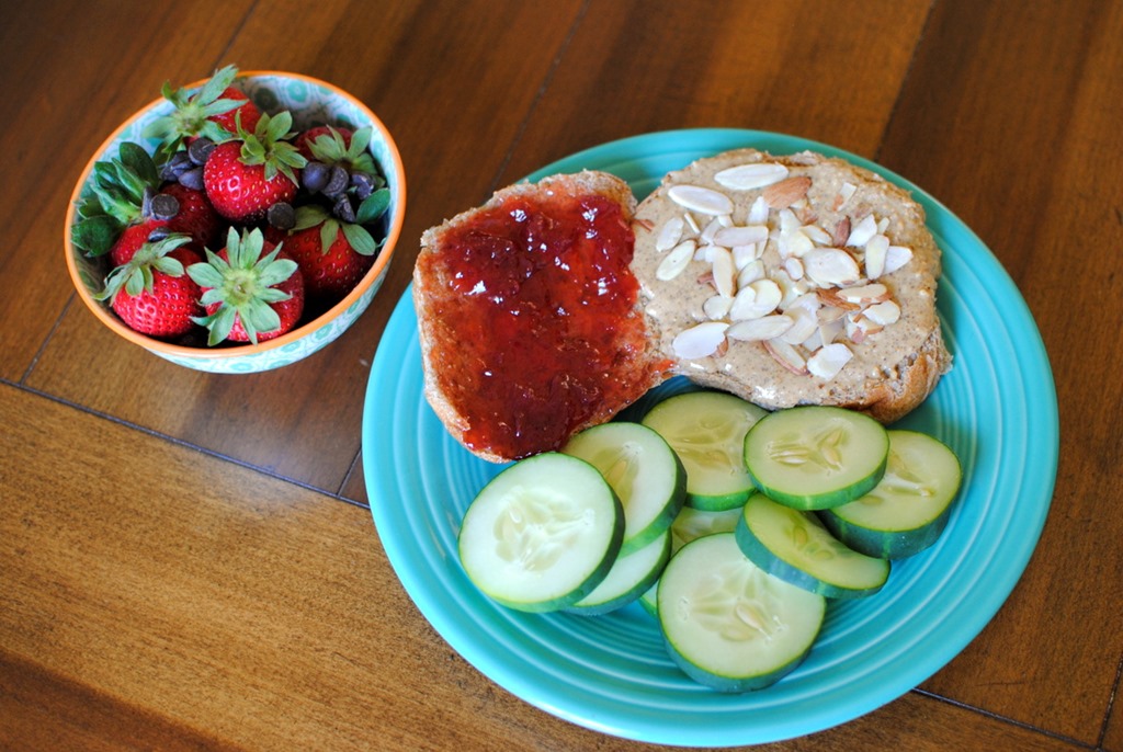 I dug into an almond butter and jelly sandwich topped with slivered almonds on a whole wheat hamburger bun. I paired my sandwich with cucumber slices and fresh strawberries with a sprinkling of dark chocolate chips.