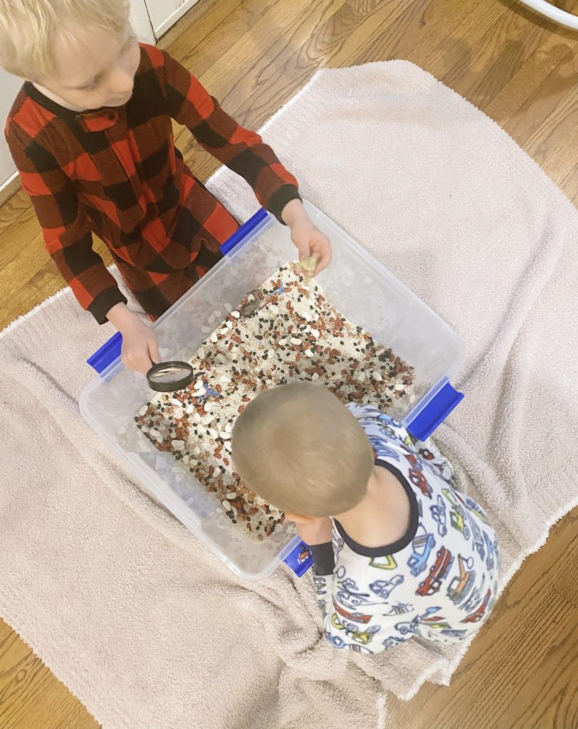 Chase and Ryder played in their room for a bit while we eased into the day with Rhett and coffee. Eventually the big kids joined us downstairs and after breakfast, we set up a little sensory excavation station with dried rice and beans and dinosaur toys.
