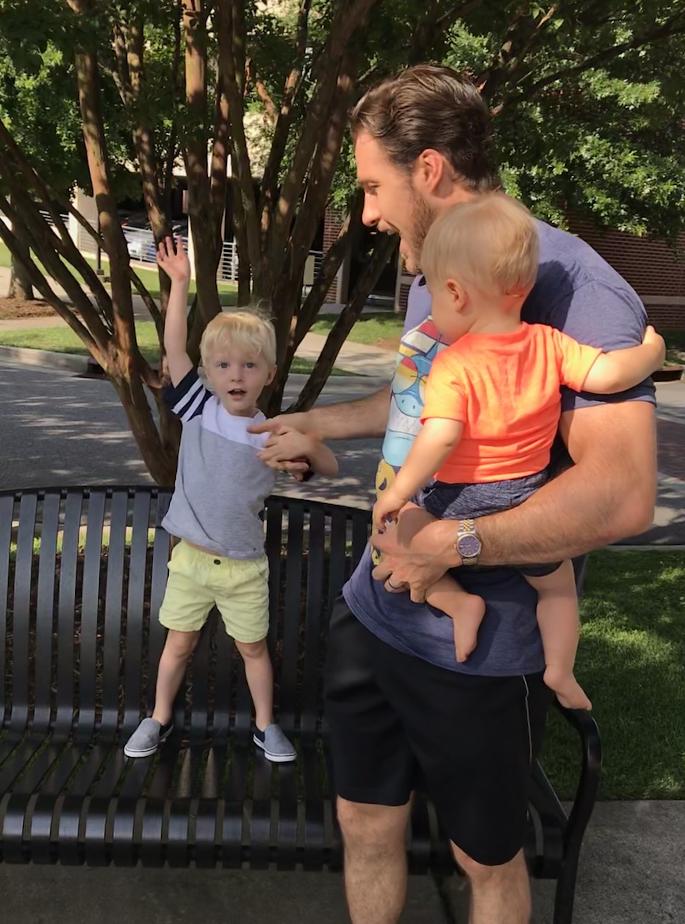 While the ice cream base chilled in the freezer, Ryan and I spent some time organizing things around the house as the boys napped. Ryan’s workout buddy recently moved to a different part of Charlotte so he’s back to utilizing our garage gym on a daily basis rather than just a few times a week. This inspired Ryan to clear out a bunch of things from our garage and we ended up driving a load of stuff to Play It Again Sports once the boys were up. Oh and apparently Play It Again Sports is a kid paradise. Who knew!? They let Chase test out lots of different sporting equipment, a bike with training wheels, a skateboard and more. When we left, Chase asked if we could go back there again sometime. Ha!