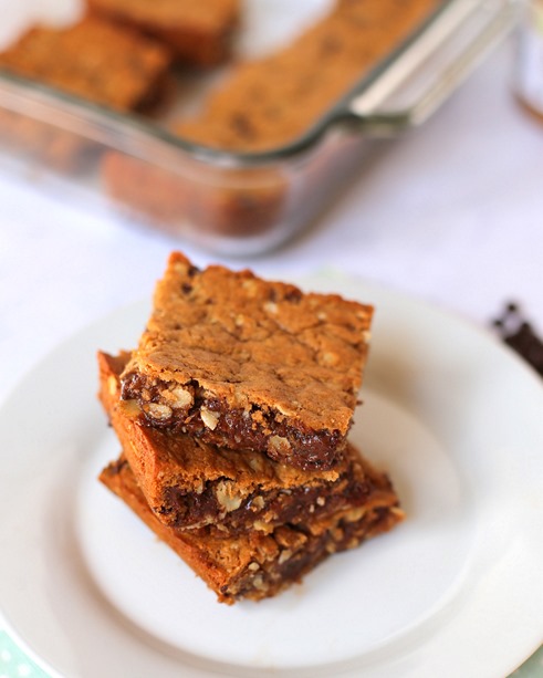 These chocolate chip almond butter bars taste like the perfect hybrid between a chocolate chip cookie and an almond butter blondie. The recipe calls for mini chocolate chips which I love because the tiny chips melt into the bars and make them extra chocolaty and almost brownie-like.