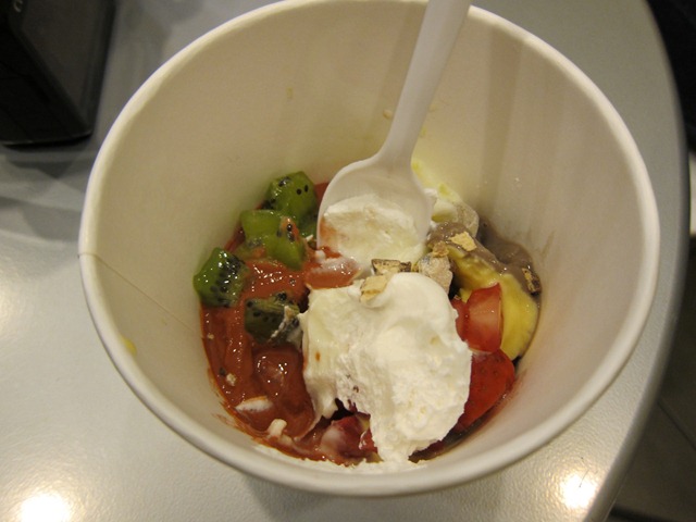 I ate a bit before snapping a picture, but my mix included red velvet, cake batter, cookies ‘n’ cream and tart frozen yogurt topped with whipped cream, strawberries, kiwi, Kit Kat pieces, cookie dough and mocha toffee bits.