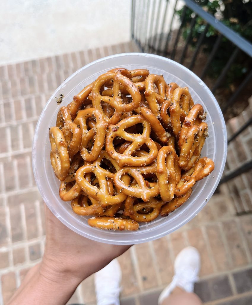 (To make the pretzels, I just tossed a whole bag of pretzels in 3/4 cup oil with 3 tbsp. Tastefully Simple garlic pepper seasoning and cooked them at 200 degrees for 50 minutes, tossing halfway through.)