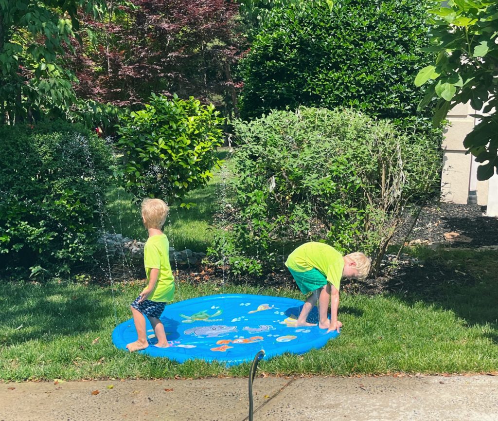 After our family walk, we set up a bunch of water play toys in the front yard — a kiddie pool, water table (it was basically a terrarium we had to clean out before filling with water) and sprinkler splash pad — for the kids to play with while we enjoyed slowing down a bit and watching them have a blast.