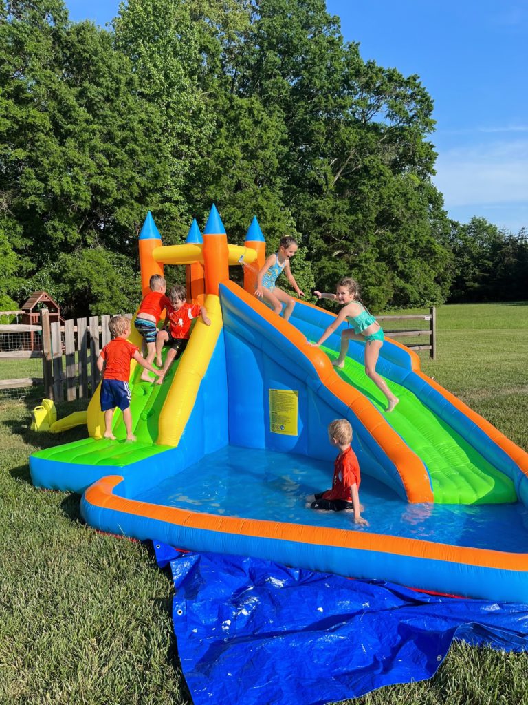 Our Friday night plans took us to my friend Lauren’s house for our second-to-last Soccer Shots practice for the big kids. Since temperatures eclipsed 90 degrees on Friday soccer practice looked like half soccer and half water bounce house fun for the kids.