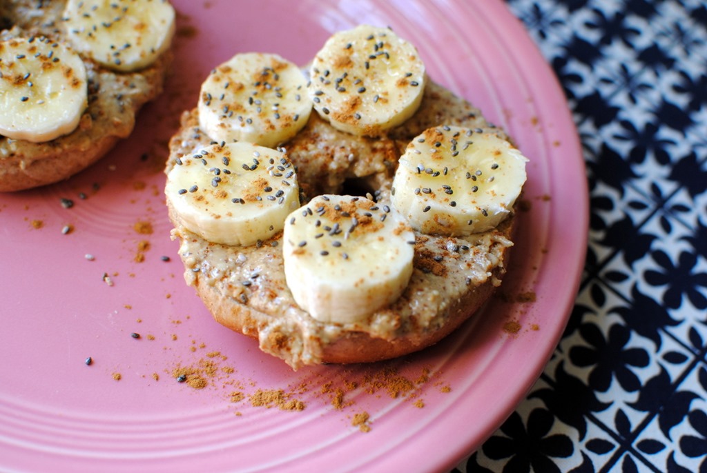 On the menu for today: A toasted bagel topped with almond butter, banana slices, cinnamon and chia seeds