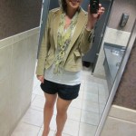Tan corduroy blazer: Banana Republic Outlet (You may see this worn another way here.) White tank top: Forever 21 Scarf: BCBG (Purchased this weekend for $9!) Navy cuffed shorts: J.Crew Outlet Wedges: Charles David Headband: J.Crew Outlet (For a close up, click here.)