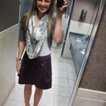 Gray shrug: New York & Company White tank top: Forever 21 Purple skirt: The Limited Nude pumps: Gabriella Rocha Infinity scarf: Express Watch: Michele Bangle: Brighton Bracelet: David Yurman Pale legs despite numerous applications of build-a-tan lotion: Julie Fagan Clearly I love wearing every nice piece of jewelry that I own at once. I get…