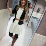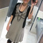 Gray dress: Cynthia Rowley (via TJMaxx) Black tank top: Forever 21 Black cardigan: Guess Black tights: Old Navy Brown riding boots: Colin Stewart (via Victoria’s Secret) Black beaded necklace: I can’t remember!