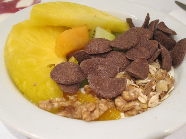 I opted for a bowl of creamy yogurt topped with fresh pineapple, kiwi, museli, walnuts, cantaloupe and chocolate cereal.