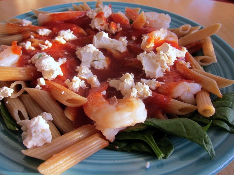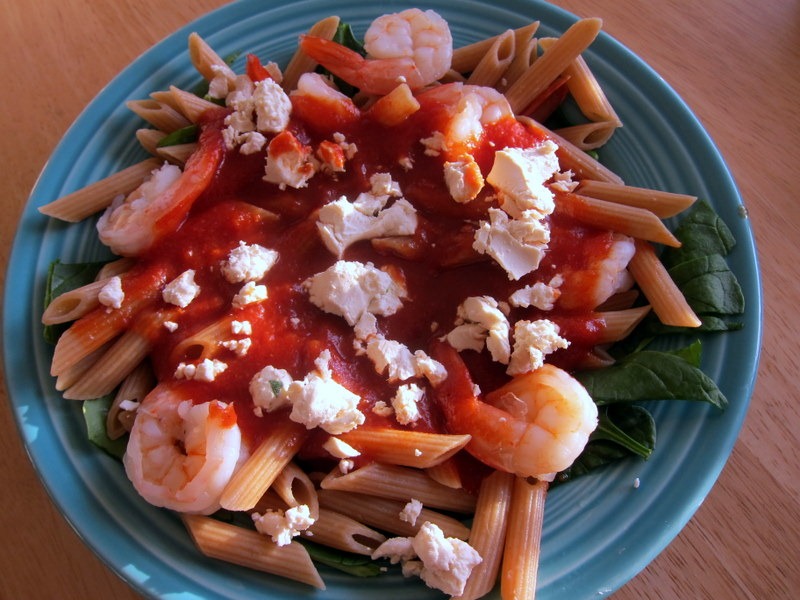 I made a quick bowl of pasta featuring whole wheat penne, shrimp, spinach, tomato sauce and goat cheese.