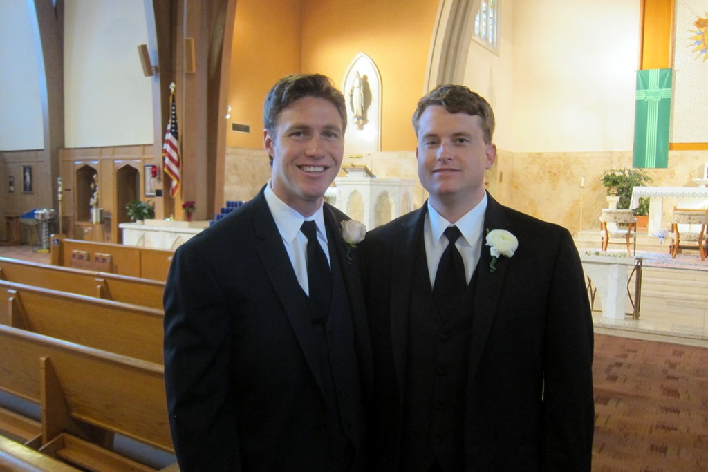 Before I knew it, I needed to start getting ready for the ceremony. Once I was dressed, I walked into the hotel lobby to meet up with other wedding guests to hop on a 12:30 p.m. shuttle to the church. While we were waiting to board, I saw Ryan, Terry and the other groomsmen taking some pictures!
