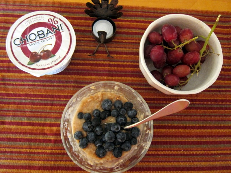 I ate my remaining Kashi instant oats topped with blueberries and served them with a side of grapes and black cherry Greek yogurt.