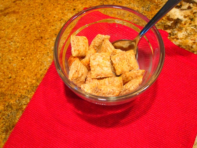 While I was blending the smoothie, I also snacked on a small bowl full of mini wheats cereal with milk.