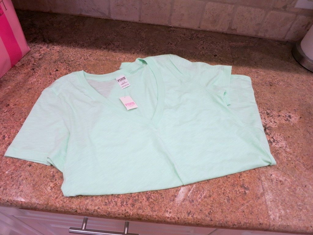 Ryan was a trooper and headed into Victoria’s Secret with me so I could exchange a bikini top I ordered for a larger size. (I got this one in Brazilian Teal/Neon Lemon.) Aside from my bikini top, we also left with something quiiiiite sexy. A comfy oversize t-shirt. Oh yes!
