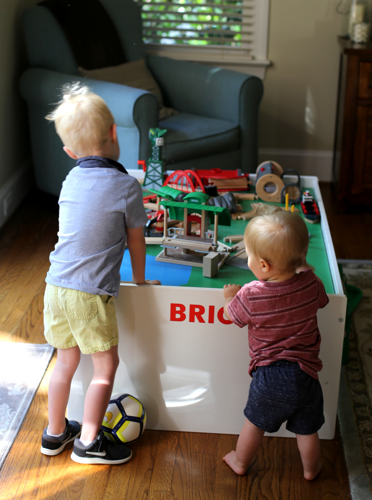 (As you can see from the crazy train tracks, the boys’ train table gets hit by Hurricane Ryder just about every day around here.)