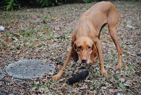 it WAS an elongated tennis ball toy, but she ripped off the neon fuzzy coating.