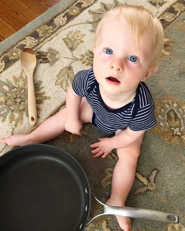 This week, I busted out our pots and pans as “toys” for Chase and was shocked by just how long they entertained him! He had so much fun banging around and playing with our pots and pans and this little activity bought us more “happy baby entertainment” time than usual, so I was stoked. I’ve had a couple of friends recommend taking a bucket of water and some pots and pans outside for even more playtime fun, so that is on our radar, too! At least until our water table arrives! (I ended up ordering a water table last week thanks to an awesome blog reader who let me know about a great sale on Zulily! I ended up going with this one after reading a bunch of various water table reviews.)